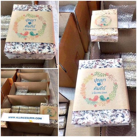 จัดส่งข้าวกล้องหอมมะลิเเละข้าวจัตุรงค์ (ฉลากงานเเต่ง) ขอแสดงความยินดีเเละขออวยพรให้มีความสุขมากๆนะครับ ข้าวกล้องหอมมะลิ เป็นข้าวคุณภาพที่ชาวนาสุรินทร์ภูมิใจอย่างมาก นอกจากจะอุดมไปด้วยวิตามิน B และ ข้าวจัตุรงค์ เป็นข้าวที่ผสมข้าว 4 ชนิด หอม นุ่ม เหมาะสำหรับผู้ที่เริ่มฝึกทานข้าวกล้อง เเล้วยังมีรสชาติอร่อย หอม นุ่ม เป็นของรับไหว้ที่ผู้ให้เเสดงถึงความใส่ใจเรื่องสุขภาพของผู้รับได้เป็นอย่างดี